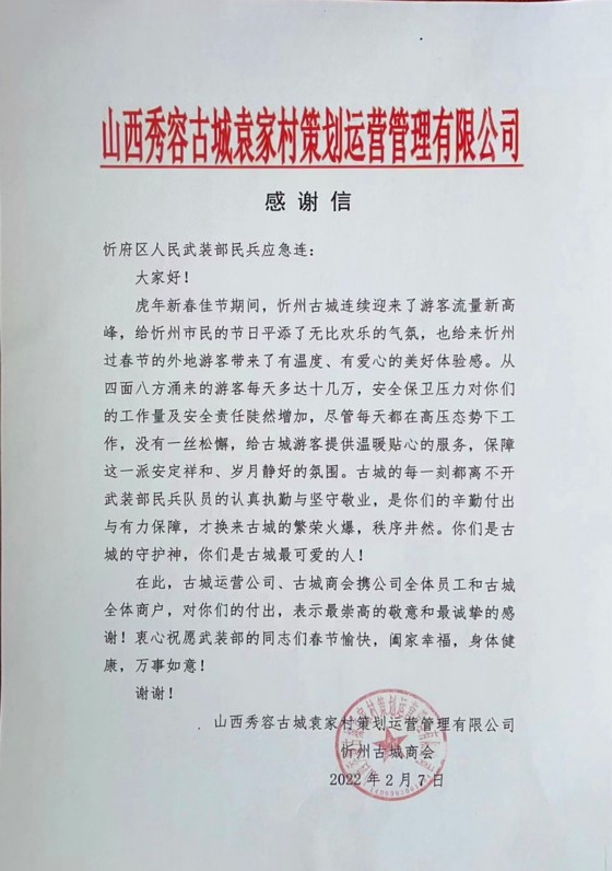 感謝信中,山西秀容古城袁家村策劃運(yùn)營(yíng)管理有限公司和忻州古城商會(huì)對(duì)物業(yè)公司民兵應(yīng)急連在春節(jié)期間面對(duì)古城客流量增大,隊(duì)員們堅(jiān)守崗位,圓滿(mǎn)完成安保任務(wù)給與了充分肯定和表示了崇高敬意,并致以衷心感謝和衷心祝愿!