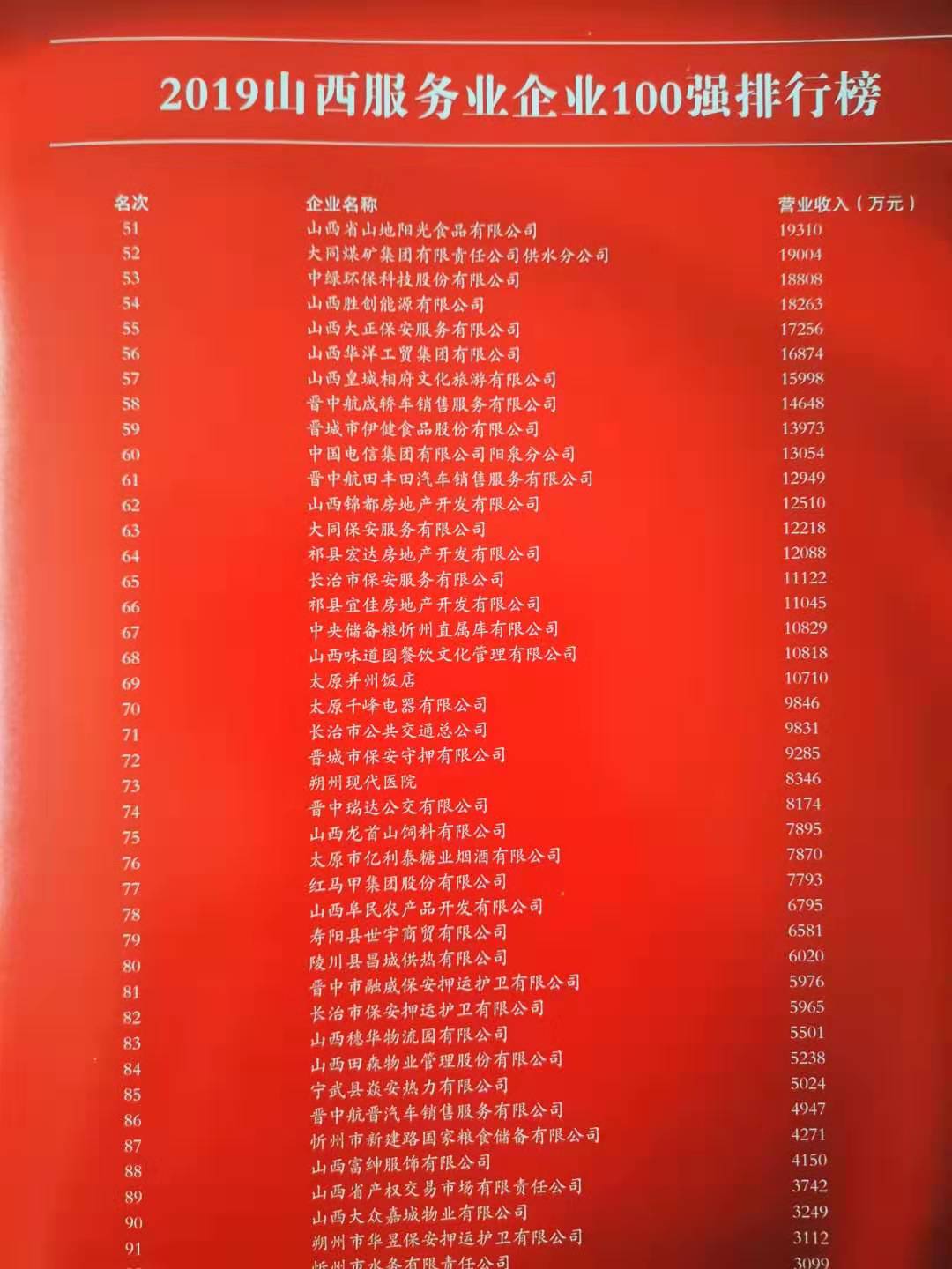 11月8日,2019山西企業(yè)100強在省城太原發(fā)布。經(jīng)山西省百強企業(yè)排序專家委員會審定,山西大正保安服務有限公司再次榮獲“山西省服務業(yè)100強企業(yè)”,這是該公司自2014年以來連續(xù)五次榮登該榜。公司黨委副書記、副總經(jīng)理陳志平前往參會。