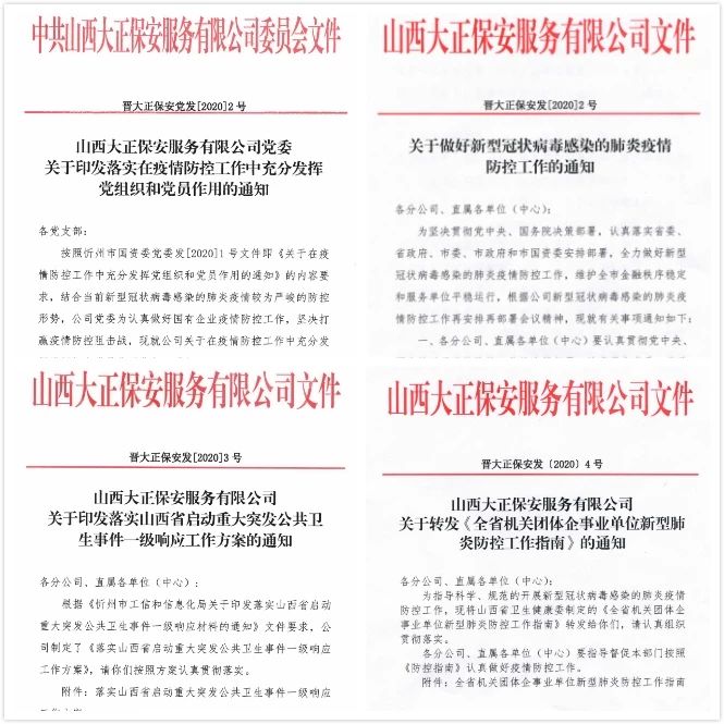為深入貫徹習(xí)近平總書(shū)記對(duì)新型冠狀病毒感染肺炎疫情防控工作的重要指示精神,堅(jiān)決落實(shí)黨中央重大決策部署及省委、市委、市國(guó)資委部署安排,山西大正保安服務(wù)(集團(tuán))有限公司印發(fā)《關(guān)于做好新型冠狀病毒感染的肺炎疫情防控工作的通知》、《山西大正保安服務(wù)有限公司關(guān)于印發(fā)落實(shí)山西省啟動(dòng)重大突發(fā)公共衛(wèi)生事件一級(jí)響應(yīng)工作方案的通知》,要求公司各部門(mén)把防控疫情作為當(dāng)前最重要的工作來(lái)抓,落實(shí)落細(xì)防控措施,切實(shí)保障員工安全,保障全市金融秩序穩(wěn)定和服務(wù)單位平穩(wěn)運(yùn)行。集團(tuán)公司黨委印發(fā)了落實(shí)在疫情防控工作中充分發(fā)揮黨組織和黨員作用的通知,要求基層黨支部、全體黨員深刻認(rèn)識(shí)疫情防控形勢(shì),全面落實(shí)我市“五嚴(yán)五防”措施,用實(shí)際行動(dòng)踐行初心使命。