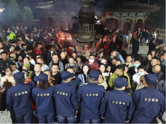 凌晨0點過后,車流量、人流量逐步增多,還愿、許愿香客絡(luò)繹不絕,執(zhí)勤隊員一邊要維持秩序,一邊還要檢查是否攜帶香火蠟燭燈等易燃物品進入寺廟。凌晨0時直到次日中午12時在長達 24個小時的時間里,公司帶隊領(lǐng)導(dǎo)和隊員們始終堅守在一線,充分體現(xiàn)了大正保安人紀(jì)律嚴(yán)明、吃苦耐勞、能打硬仗、團結(jié)一致的優(yōu)良作風(fēng)。執(zhí)勤中,全體保安隊員堅守崗位、履職盡責(zé)、文明執(zhí)勤,維持秩序、服務(wù)群眾,營造了安全祥和的氣氛,圓滿完成了此次廟會安;顒樱故玖藝蟊0矊I(yè)水準(zhǔn)和良好的精神風(fēng)貌。