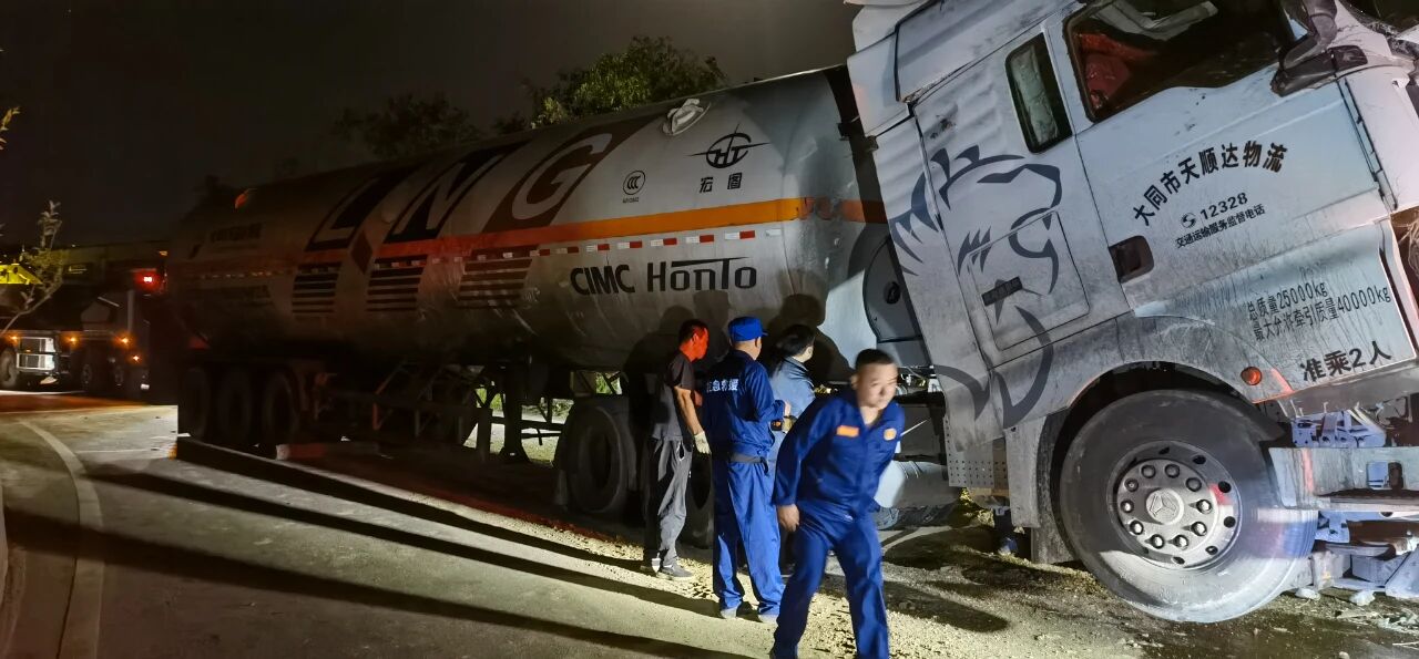 2025年9月6日,一輛裝載液化氣的重型半掛牽引車在土崖塔鄉(xiāng)寨上村附近路段發(fā)生側(cè)翻,現(xiàn)場情況緊急。縣應(yīng)急管理局救援大隊(duì)、縣公安局、縣消防救援大隊(duì)、保德守押中隊(duì)?wèi)?yīng)急救援隊(duì)等多部門迅速響應(yīng),第一時(shí)間趕赴現(xiàn)場協(xié)同開展應(yīng)急救援工作,全力守護(hù)群眾生命財(cái)產(chǎn)安全。經(jīng)現(xiàn)場查看,氣罐車罐體出現(xiàn)輕微變形,并伴隨機(jī)油等混合液體流出,液化氣具有易燃易爆特性,事故地點(diǎn)臨近村落,嚴(yán)重威脅了人民群眾生命財(cái)產(chǎn)安全和過境車輛安全交通安全。